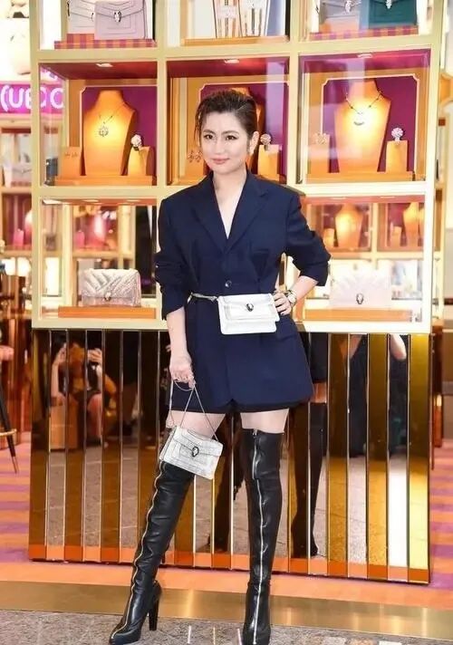 姐妹们知道,同样围度的人,只要身高变高,视觉上自然就显得更瘦了。视觉增高有两种方法,要么用高鞋跟来“实际”增高,要么提高腰线利用视线错觉来“虚拟”增高。这里Selina为我们示范了殿堂级的增高显瘦方法,即“高腰线+高跟鞋”。一件藏蓝色中长款西装配黑色短裤大玩下半身消失,一双过膝恨天高长筒靴酷帅又洒脱,最吸睛的是她用一个白色小腰包明确了高腰线,整套搭配使身高和气场都在蹭蹭蹭的上涨。