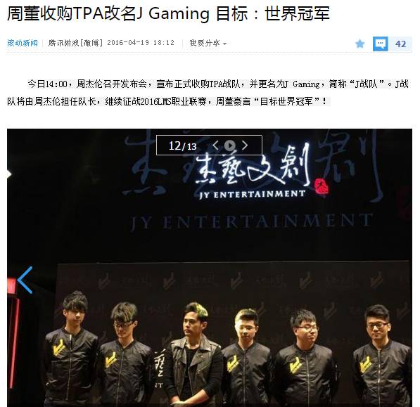 当然这都不算啥,更可怕的是周杰伦收购了一支台湾名叫TPA的战队,改了名字叫“J Team”,正式进入职业电竞圈~