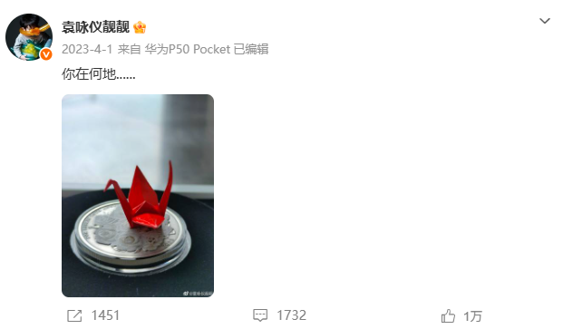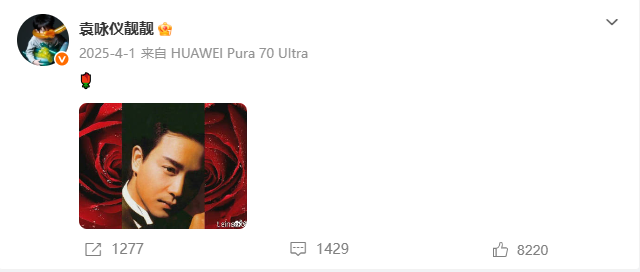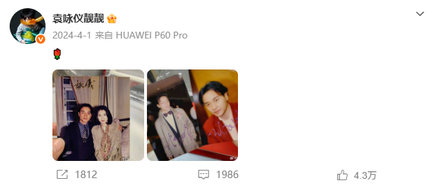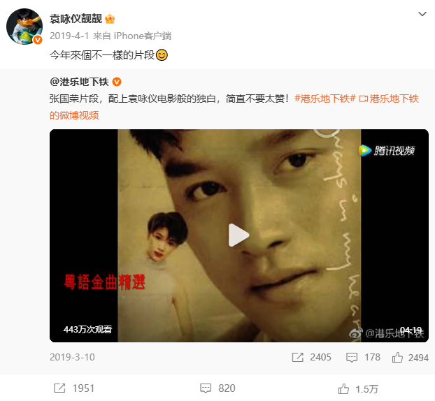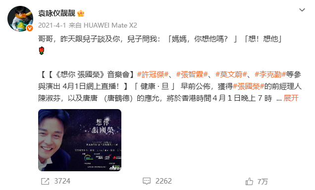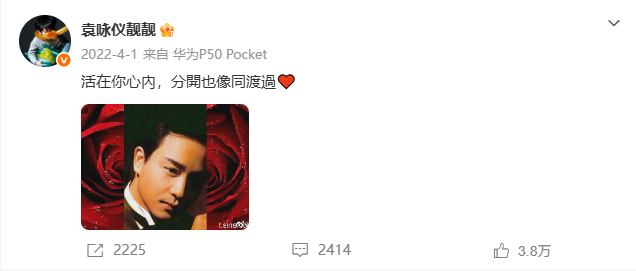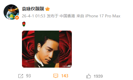 4月1日凌晨,演员袁咏仪在社交媒体发布动态,怀念张国荣。