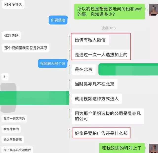 事儿还没完,在某爆料论坛,有人称韩其原的前男友亲自现身来投稿爆料了,投稿的内容全部是聊天记录而且非常长。首先爆料者称韩其原的前男友称与吴亦凡视频通话的女主就是韩其原自己。