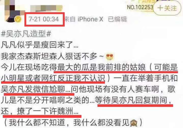 但7月21日的时候,确实有一位吴亦凡粉丝,说看到一个网红还是什么一直和吴亦凡微信聊天,期间还撩了许魏洲。