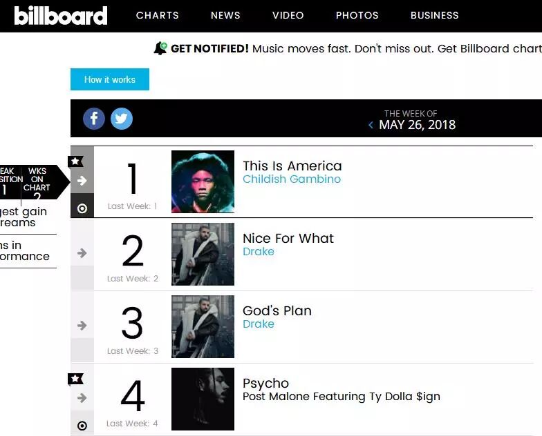 2018年第22期美国Billboard单曲榜Top 100已经连续2周前4名都是说唱音乐了,而上次在流行乐坛出现这样的局面已经是2009年的事了。