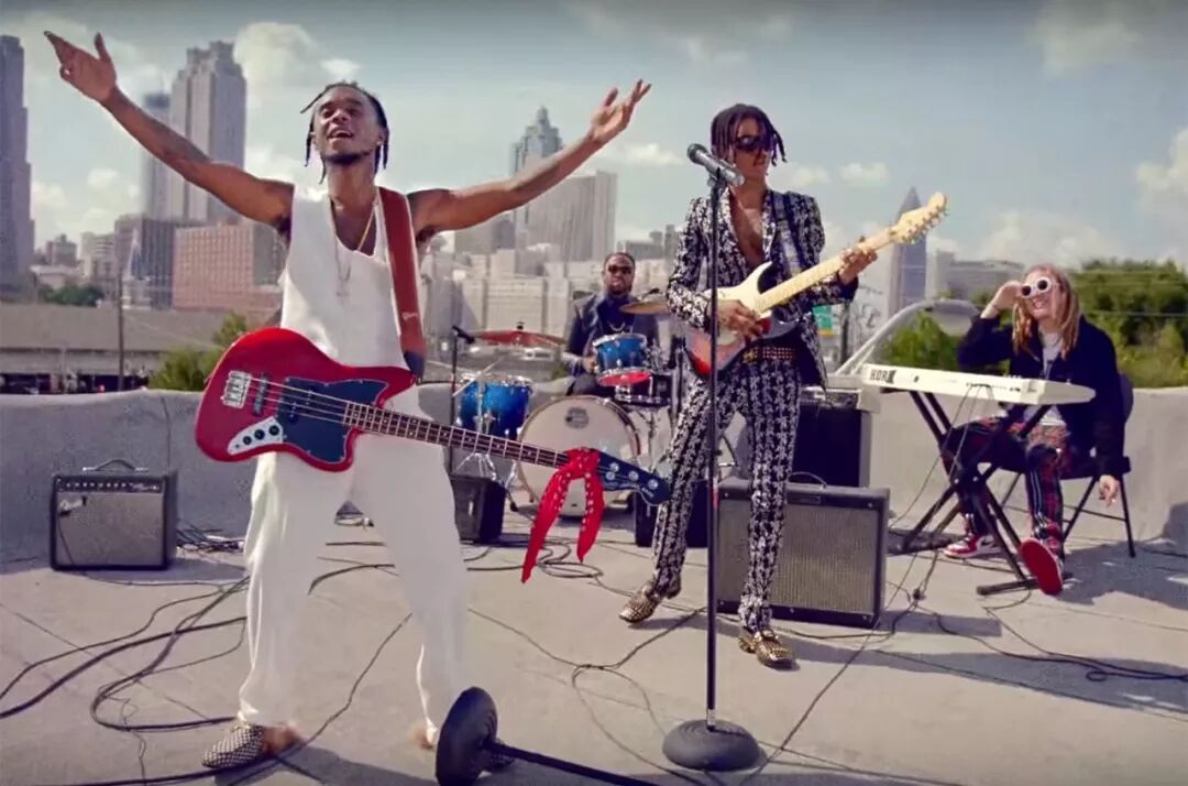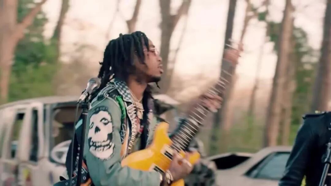 最近被中国新说唱请为导师的Migos也在他们的MV里也玩过摇滚范,虽然他们的歌里一点电吉他的元素都没有