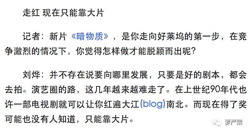 而到了2007年,年刘烨和梅里尔·斯特里普一起拍了《暗物质》,跟记者聊到现在演艺圈的路难走,现在得了表演奖也没人知道,走红只能靠(商业)大片。