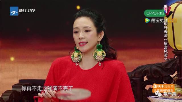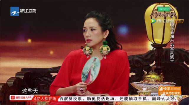 说是即兴无台本,但章子怡跟刘烨基本上是在两个次元,章子怡是努着劲儿想演个宫廷感,眼神、身段、扇扇子的动作都在认真进入状态。