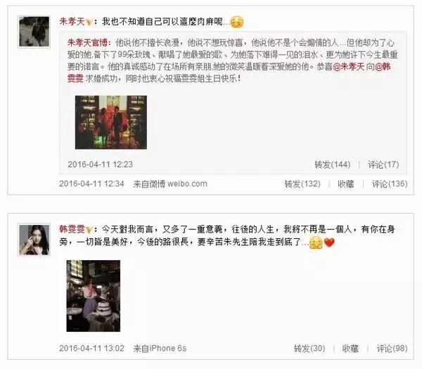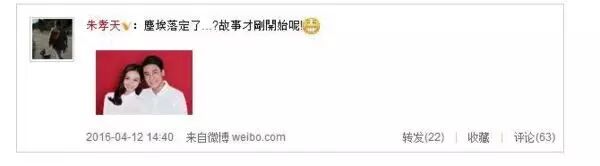 4月11日凌晨,台湾男星丁春诚还在微博分享出朱孝天现场深情演唱的视频。丁春诚微博送上祝福,“@朱孝天 @韓雯雯 ,祝福你们俩!人生经历了一切,只不过就是为了寻找一位身旁的知音和一辈子的听众!”