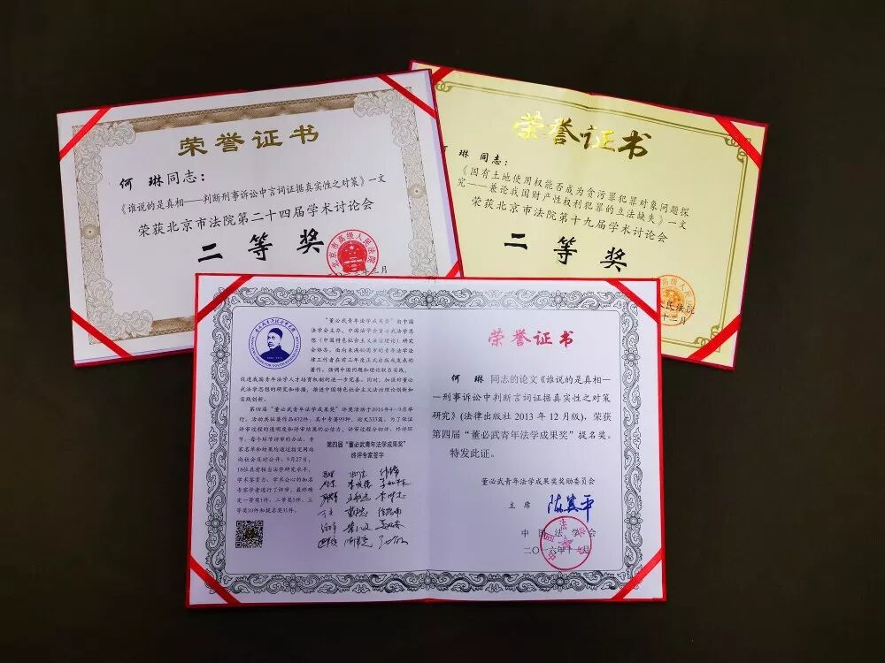 同时,何琳同志刻苦钻研审判业务难题,撰写了多篇有价值的学术论文,其中撰写的《国有土地使用权能否成为贪污罪犯罪对象问题研究》等两篇论文分别获得北京市法院系统第十九届、第二十四届学术讨论会二等奖;撰写的论文《刑事诉讼中判断言词证据真实性之对策研究》荣获中国法学会主办的第四届“董必武青年法学成果奖”提名奖的国家级奖项;另有多篇论文及案例分析发表于《北京审判》等刊物,还被收录于百度文库。