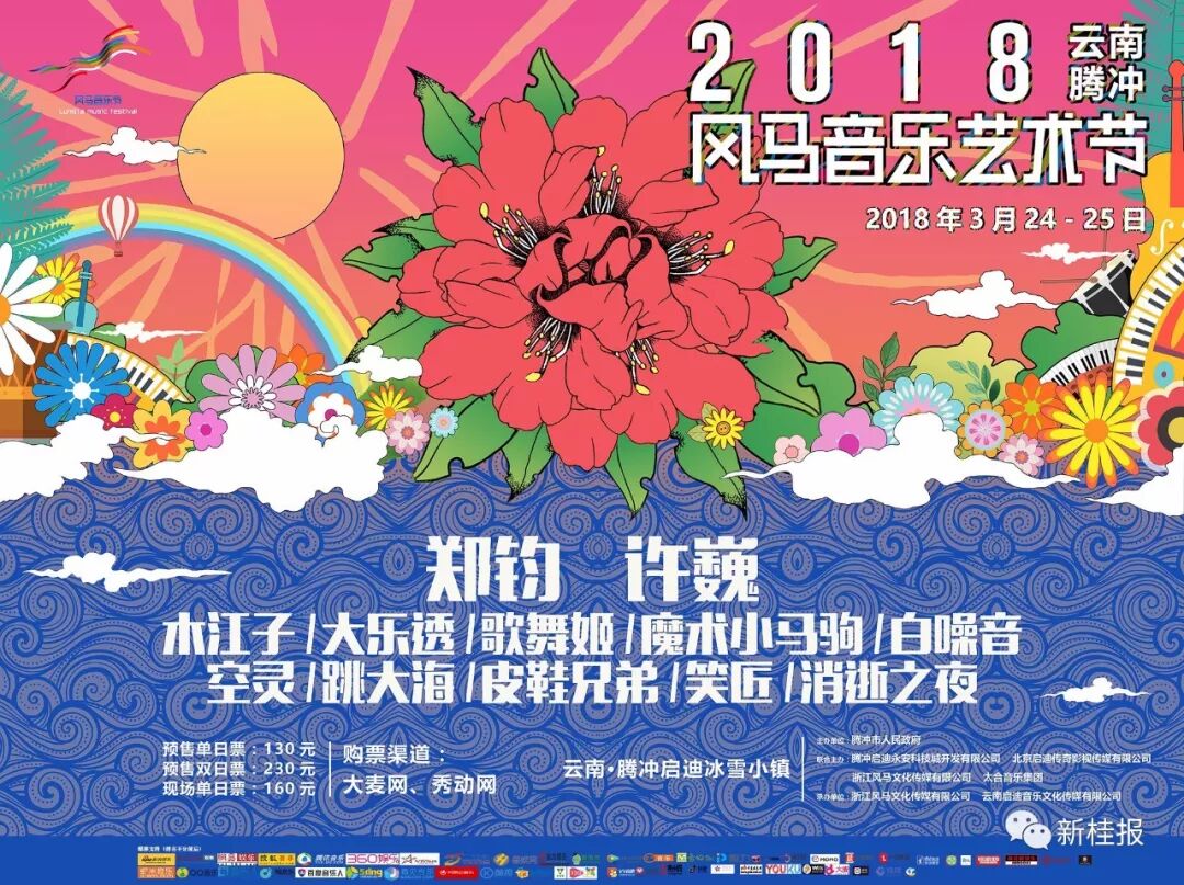 “最适合旅行的音乐节”2018云南腾冲风马音乐艺术节3月24日—25日将在云南腾冲启迪特色小镇举行,随着第一波阵容首发之后,音乐节全阵容正式亮相,由郑钧,许巍领衔,笑匠乐队、空灵乐队、跳大海乐队、皮鞋兄弟乐队、消逝之夜乐队、大乐透乐队、木江子乐队、魔术小马驹乐队、白噪音乐队、歌舞姬乐队等十二组风格各异的音乐人及乐队齐聚云南腾冲,为观众献上一场最为震撼的音乐体验。