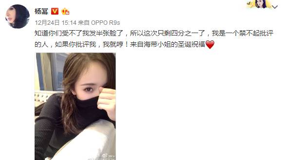 大幂幂一如既往的发了半张脸的自拍,啊不,这次比平常还少,只留了四分之一的脸。