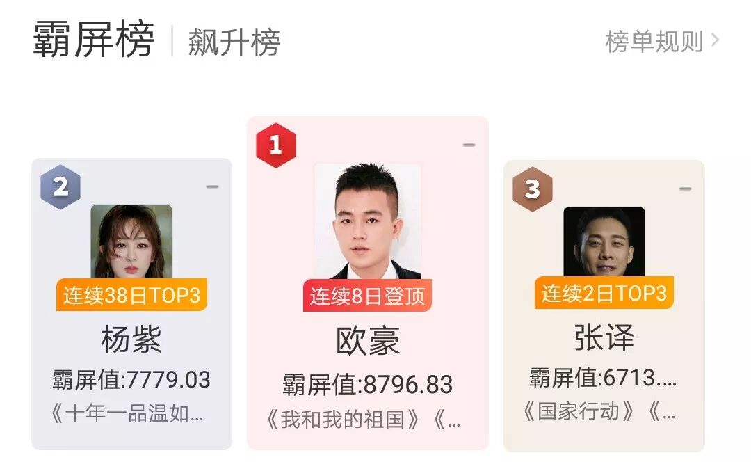 主旋律作品的集中轰炸之下,欧豪的硬汉形象也越来越深入人心。猫眼数据显示,欧豪在艺人霸屏榜上已经连续8天登顶。
