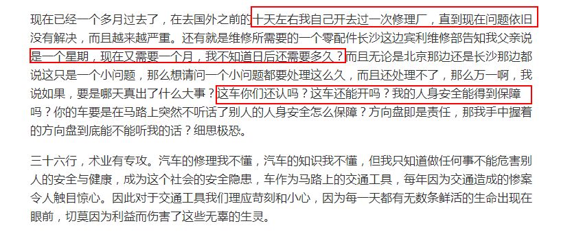 蒋劲夫还称,车辆出现问题已经一个多月,他自己开去过一次修理厂,直到现在问题不但没解决还越来越严重,长沙维修部门告知其维修需要的一个零配件要等一个星期,之后又被告知要等一个月,并对长时间不能解决问题感到不满。