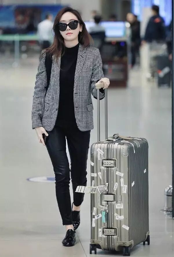 允儿的这套LOOK和宋茜的搭配有点类似,不过允儿选择的是西装外套版型,格纹比较宽大,看起来更学院风的文艺感~