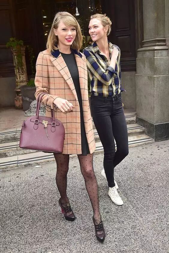 霉霉喜欢用格纹外套搭配短裙和短靴,看起来有浓浓的复古学院风格~