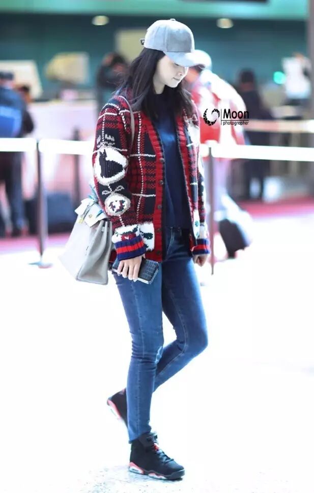 这件彩色编织千鸟格外套,搭配九分喇叭裤和回力小白鞋,显示出杨幂的衣Q很强劲!