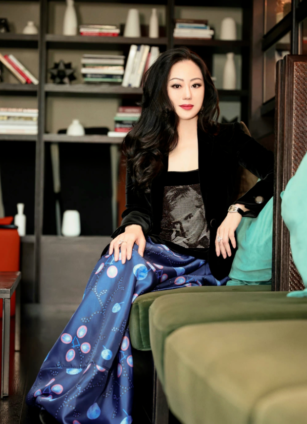 章小蕙长长的大波浪卷发浓密油润,乌黑发亮尽显高雅的气质。岁月沉淀下的女人依旧有自信和渴望,点缀精致的妆容。
