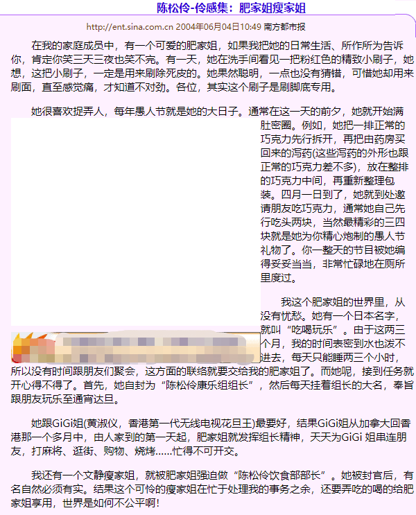 “在我的家庭成员中,有一个可爱的肥家姐,如果我把她的日常生活、所作所为告诉你,肯定你笑三天三夜也笑不完。我还有一个文静瘦家姐,就被肥家姐强迫做‘陈松伶饮食部部长’。” “肥家姐手脚笨笨地拿来能照相的手机、数码机拍照,眼睛笑成如加菲猫一样的傻。一些朋友以为是大合照,坐在她与宝珠姐中间,肥姐姐就很不爽地瞪起眼偷看旁边又旁边的宝珠姐,结果每张照片拍到的都是怪眼怪眉的她。”