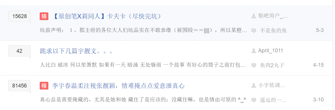 还有势头很猛的“宇靓cp”、“笔莉cp”,贴吧上的同人文到现在还有人盖楼;