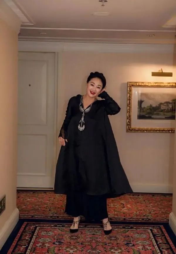 黑色的此裙子穿起来会给人一种雍容华贵的感觉了,因为这样看起来肚子胀鼓鼓的了,而且她还很喜欢把自己打扮的特别年轻,妆容也画的非常的精致啊,不像57岁的人。