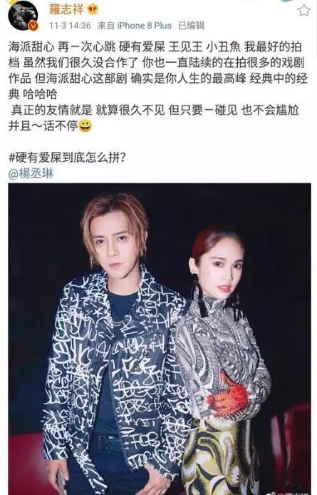 小猪罗志祥即便是发微博,也同样是一种幽默搞笑的段子风格,他在微博中直言杨丞琳人生最高巅峰就《海派甜心》这部剧!而且他竟然用"硬有爱屎"这个词来形容当年两人合唱的歌曲《in vour eves》,或许也只有他会想到这样的形容词了!不过,罗志祥对于这一次两人的再次同框,还是很开心的,不然也不会发表如此感概!