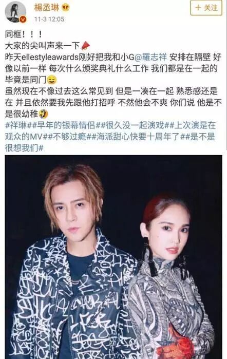 同一张配图,杨丞琳的微博配文就显得正常多了,她在文中除了感概之前两人合作时的经常在一起场景以外,更是表示现在的罗志祥依旧"幼稚"!每次必须自己先和他打招呼才行,要不然罗志祥会感到"不爽"!对于这一次的合作,杨丞琳同样表现得非常开心。