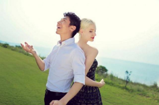 在碧海蓝天以及绿草地的映衬下,两位新人的笑容格外甜蜜!