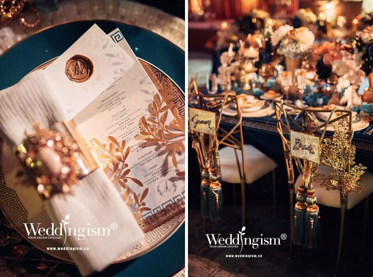 婚礼分为欢迎晚宴、敬茶仪式、婚礼仪式和晚宴四个区域,分别名为Amber Light、Agate Luck、Azure Lyre、Aventurine Leaf,每个区域均以新娘新郎的英文名首字母A、L和设计元素为核心命名。