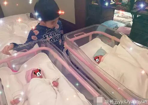 杨威的妻子杨云晒出杨阳洋和刚出生不久的双胞胎的照片,写道“三只小羊给大家拜年了”。