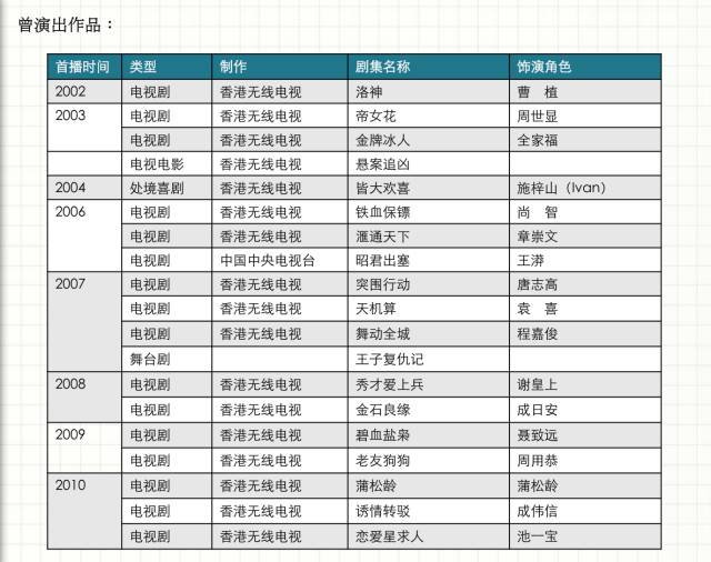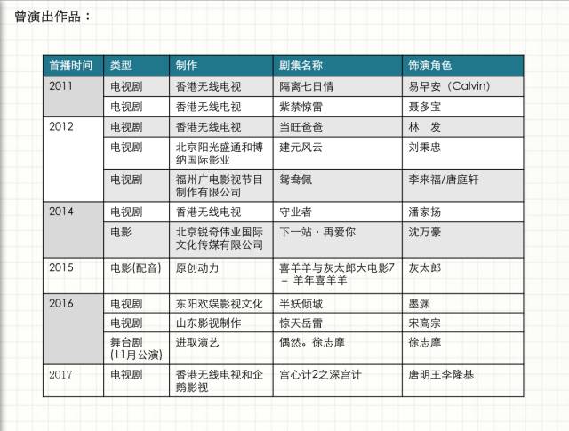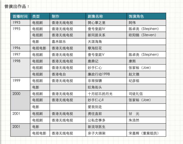 代表作品: 《鹿鼎记》《洛神》《突围行动》《隔离七日情》《铁血保镖》