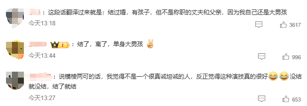 对于何晟铭的回答,网友们化身“翻译大师”,解码其潜台词:“结过婚,有孩子,但不是称职的丈夫和父亲,因为我自己还是大男孩”;也有人直言:“结了,离了,现在单身大男孩”;更有人不客气批评:“结了就结了,没结就没结,感觉他不是一个很真诚坦诚的人”!