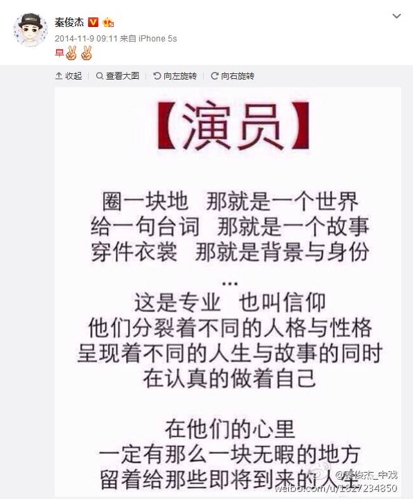 所谓演员的自我修养,就是将演戏这件事视为事业视作信仰,为之付出一生而不悔,秦俊杰就是这样。他曾在自己微博里发了一张图,以此自勉。