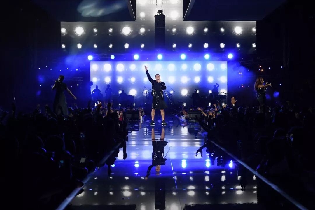 这场秀的灯光带长达 700 米,一共用到了 350 盏聚光灯,用1公里长的电缆连接,以 10 个铁架结构装置构成