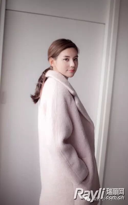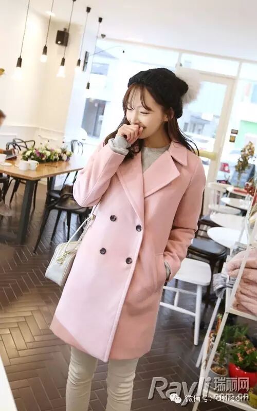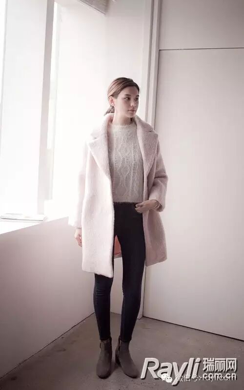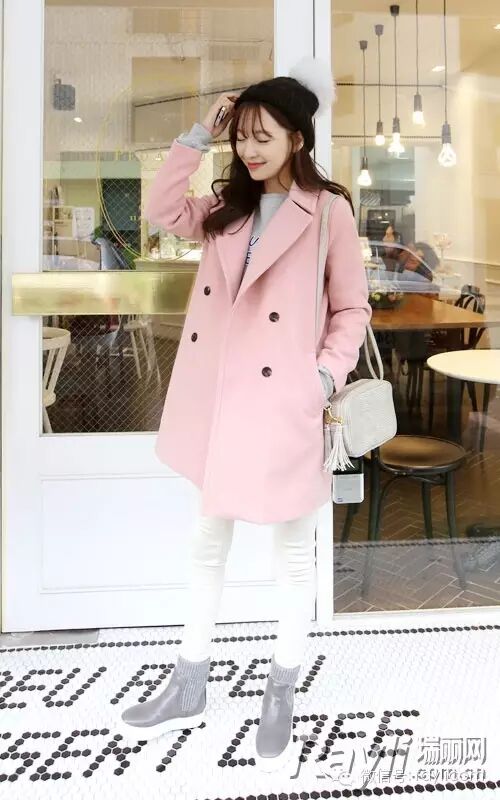 浅粉色西服领大衣搭配白色针织衫和黑色铅笔裤,衬托了清新可爱的气质,暖意十足。