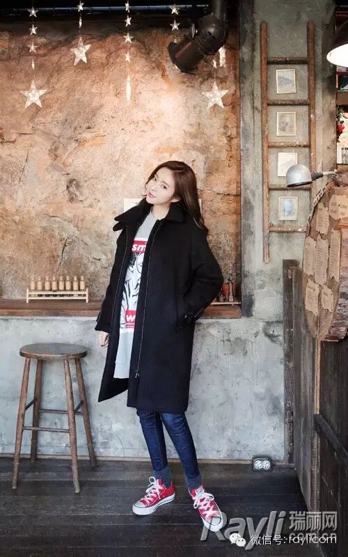 深色大衣搭配灰色图案印花长款卫衣,牛仔铅笔裤搭配运动鞋,整身搭配不见臃肿,活力十足。