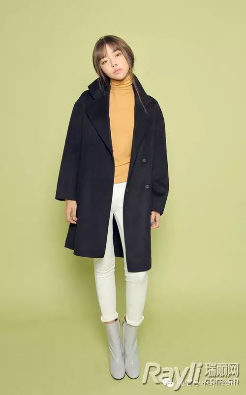 黑色长款大衣搭配姜黄色高领上衣,白色铅笔裤搭配浅灰色短靴,修饰了身形的比例,告别臃肿。