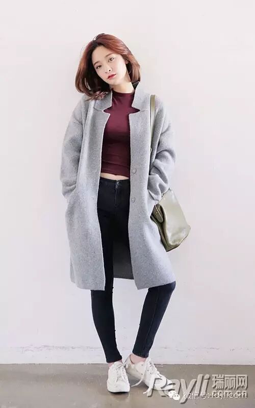 灰色的立领大衣内搭酒红色短款上衣和黑色铅笔裤,脚踩白色运动鞋,整体造型轻盈休闲。
