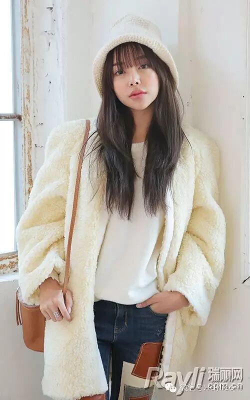 白色毛绒大衣内搭白色长袖上衣,下穿个性拼贴铅笔牛仔裤,吸睛的同时摆脱了上身臃肿的感觉。