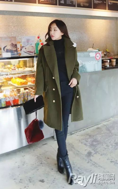 墨绿色大衣搭配黑色小高领上衣和铅笔裤