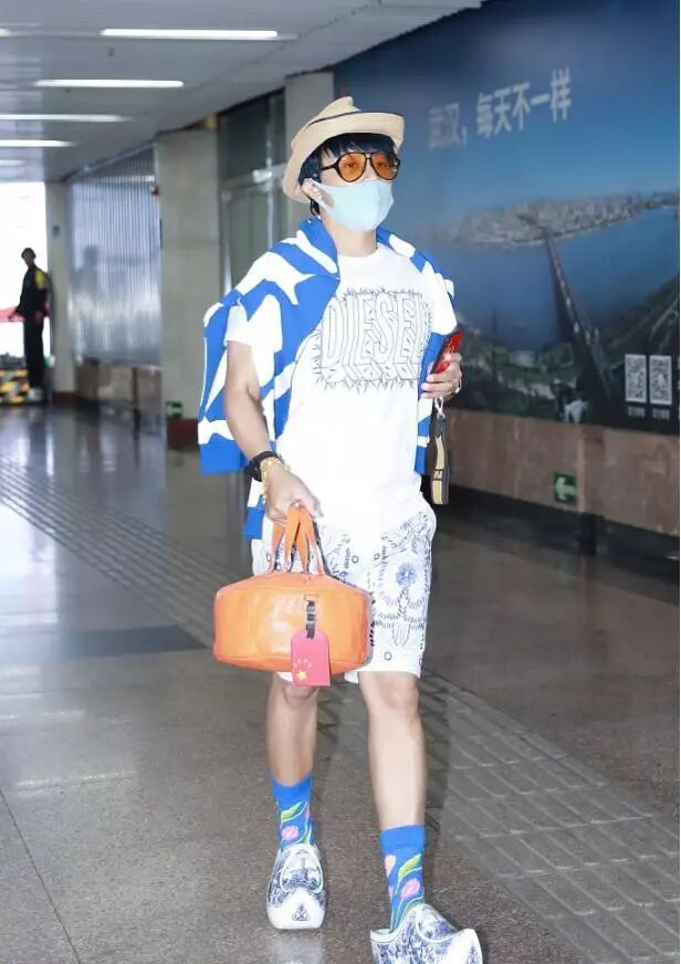 在之前的机场照片中也是如此。脚踩“青花瓷”鞋子,搭配花卉长袜,我行我素,懒理路人和媒体的“指指点点”。