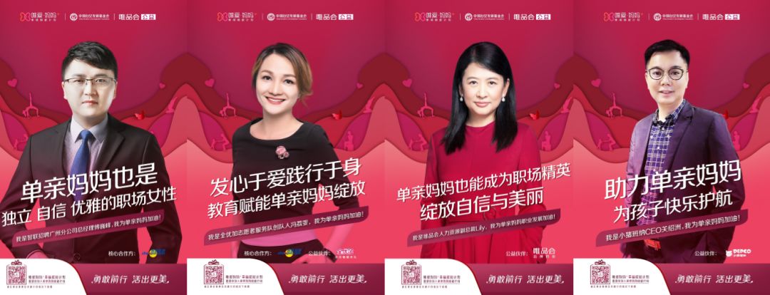 此外,唯品会、酷狗音乐、智联招聘、达能爱他美、惠氏、亲润、笛莎、小猪班纳等企业代表也同时响应,根据企业自身属性,从职场、亲子、教育等方面向社会呼吁:单亲妈妈也能成就一番事业、单亲妈妈也能教育出健康阳光的孩子。鼓励所有的单亲妈妈能勇敢前行,活出更美人生。