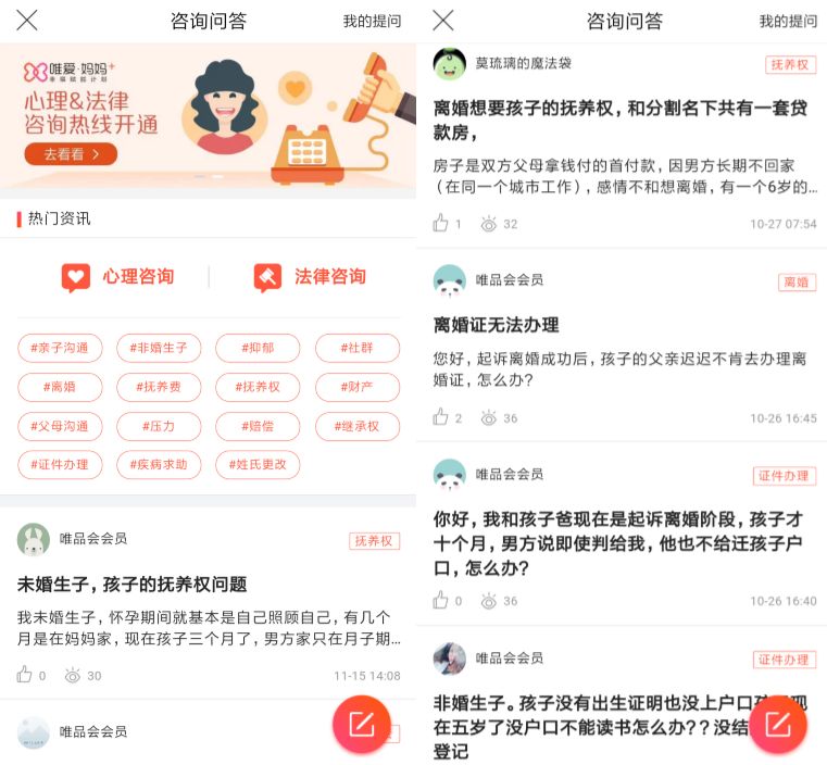 △在唯爱妈妈加油站的咨询版块,咨询团队为数以千计的女性答疑解惑,了解婚姻、财产、抚养权等问题。