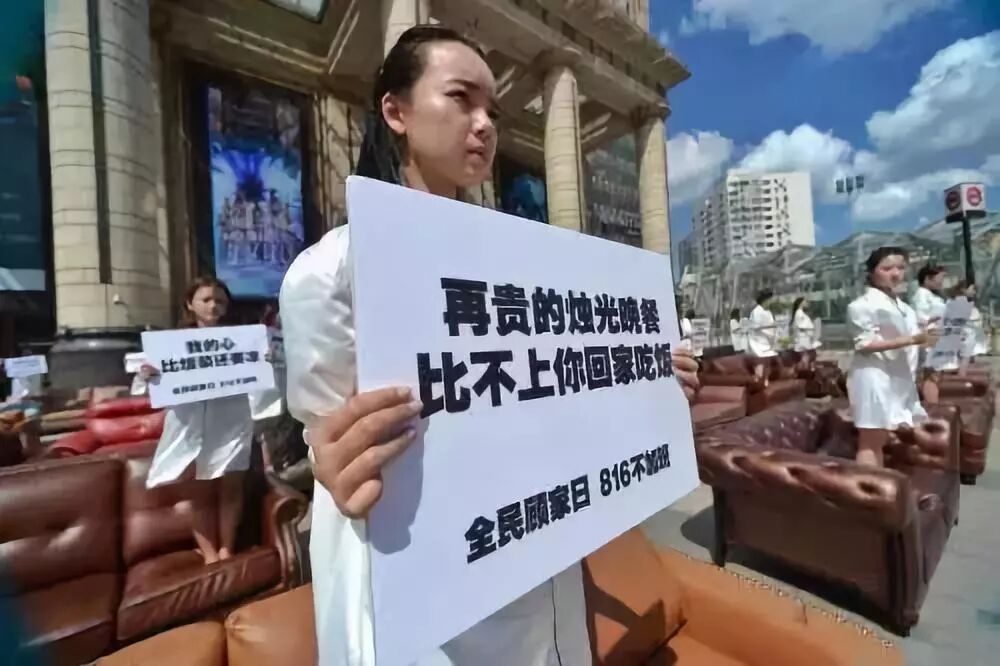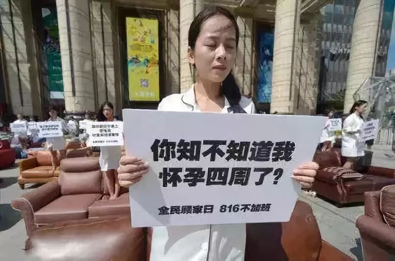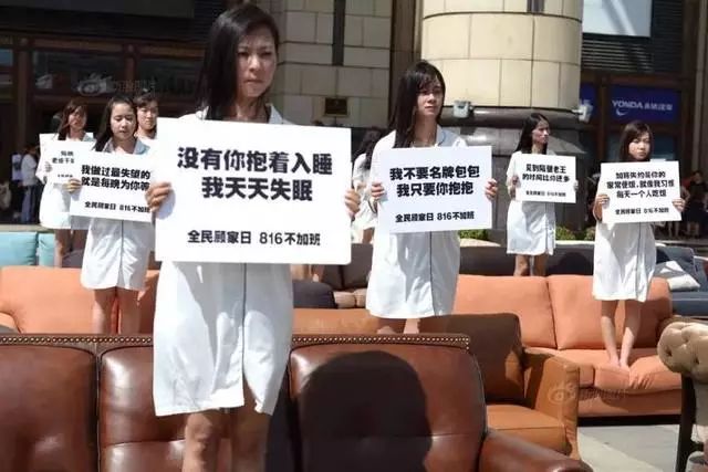 2016年8月9日,在上海街头,双人沙发依次排开,40多为穿着单薄睡衣的年轻女白领,她们站在沙发上,举着白色牌子,进行无声抗议。