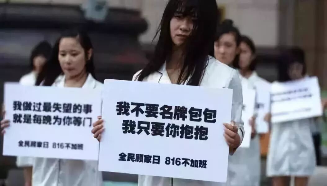 这个场景,很像她们在家中,整宿等待下班归来的丈夫一样。每名女性都手举一块白色牌子,上面写着自己的心中语录: