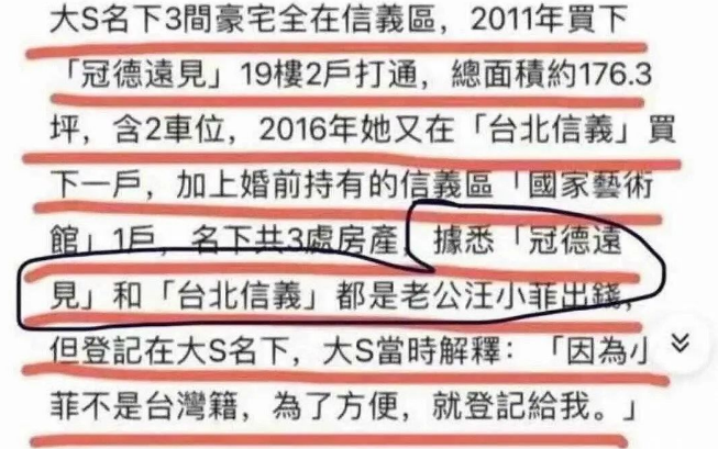 总结一下,房子登记在大S名下,但钱是汪小菲出的。