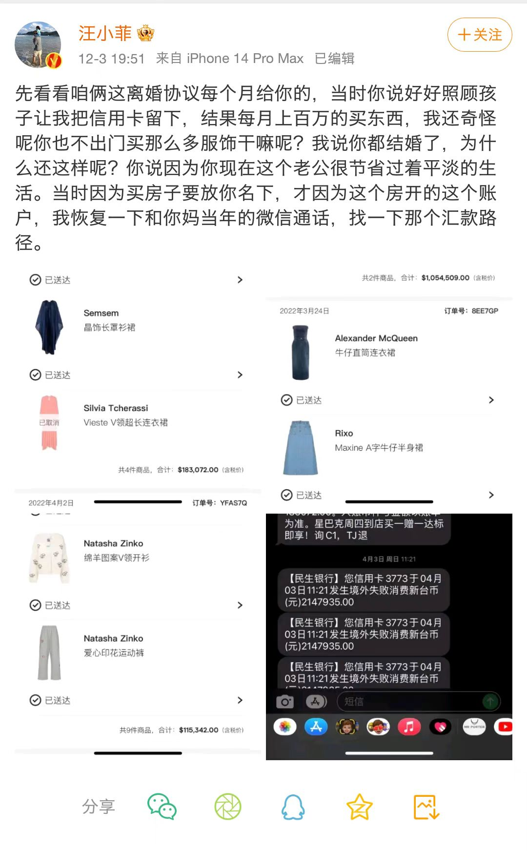 《汪小菲晒大S离婚后信用卡记录,大骂不要脸!大S晒出离婚前购别墅欠条反击》,上海全知道,2022.12.04