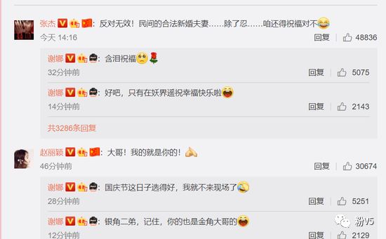 随后,张杰赵丽颖现身评论区安抚谢娜,张杰发文:反对无效!民间的合法新婚夫妻……除了忍……咱还得祝福对不。赵丽颖也力挺张杰:大哥!我的就是你的!三人在评论区一来一回,友爱互动,十分逗趣。