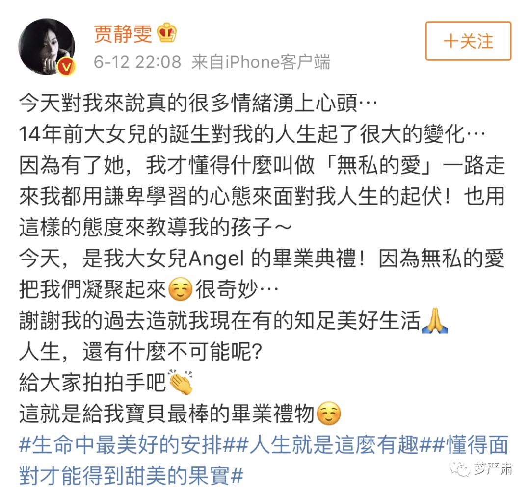 有这么多不愉快的过往,贾静雯现在还是选择跟前夫好好相处,将跟前夫、女儿的相会形容为“无私的爱把我们凝聚起来”,还加了这样一句:“懂得面对才能得到甜美的果实。”