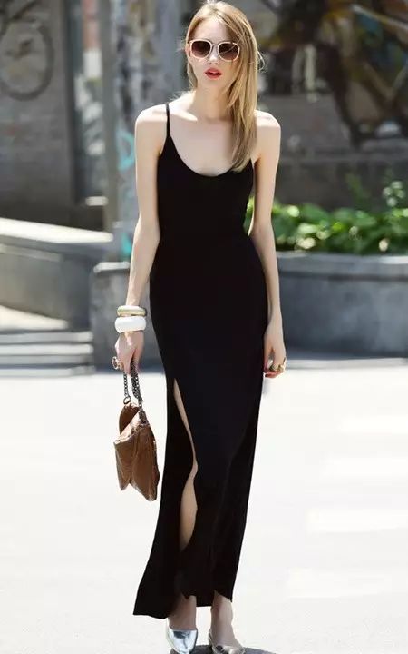 吊带裙+尖头高跟鞋,开叉的款式,简约性感~散发着浪漫的气息~