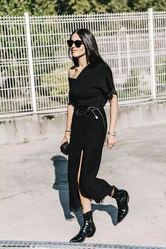 露半肩设计的开叉小黑裙,简约性感,搭配短靴,有一种硬朗的感觉!