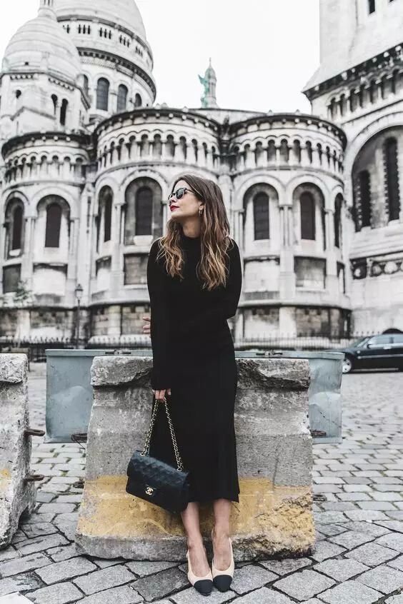 直筒款的针织连衣裙,优雅文艺搭配经典款香奈儿高跟鞋,简约大气!