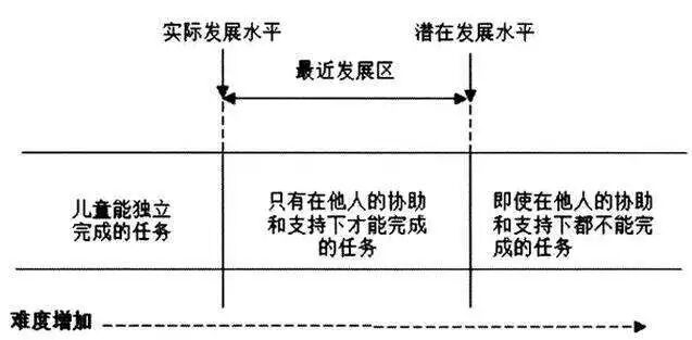这个“摘苹果实验”的结论正好验证了维果茨基提出的“最近发展区”的理论,他认为儿童的发展有两种水平,一种是现有水平,即可以运用现有知识经验独立完成任务;还有一种是准备水平,即孩子有一个潜能范围,在这个范围内的任务儿童无法独立完成,但在更有技能的人的鼓励和帮助下可以完成。